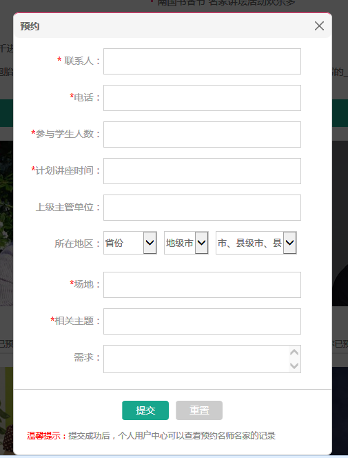 红色标记为必填项,否则无法提交,提交前请确认信息准确无误。以免影响预约活动进行。