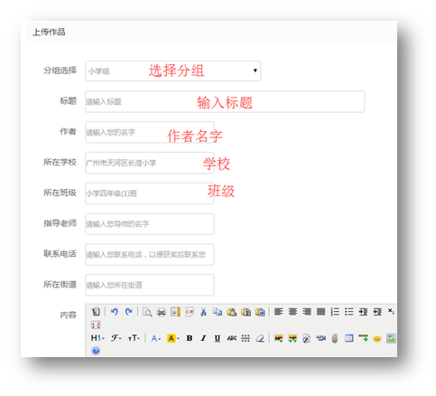 进入读后感上传页面,所在学校、所在班级不用填,请核对所在学校、所在班级是