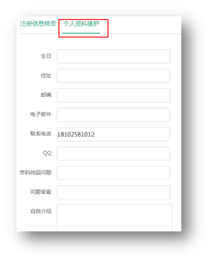 个人资料维护:生日、住址、邮编、电子邮件、联系电话、QQ、密保问题、问题