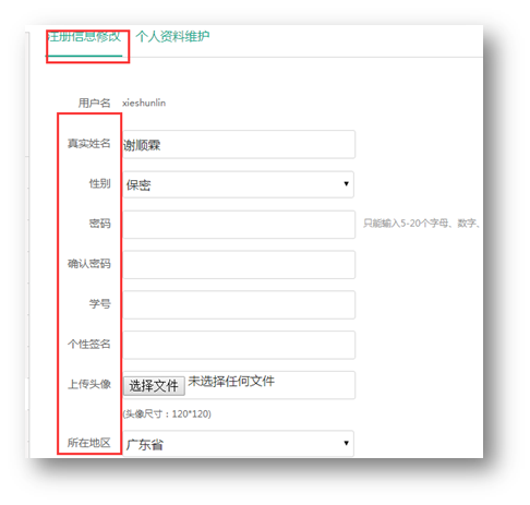 号”、“个性签名”、“上传头像”、“所在地区”、“学校”、“班级”、