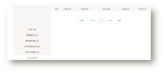 在“阅读管理”界面点击“名人名家预约”,查看本级管理员预约的名师名家活动,主要包括名家名称、学校名称、讲座主题、讲座时间、预约时间。