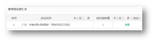 Ø 在“阅读管理”界面点击“推荐读后感汇总”,显示各学校推