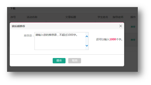 “推荐”点击后填写“推荐语”推荐读后感到省教育厅,读后感“操作”选项状态更改为“已推荐到省”。